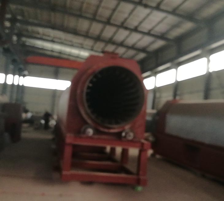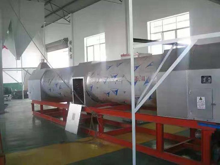 我們解決其技術(shù)問(wèn)題所采用的技術(shù)方案是:一種新型環(huán)保節(jié)能熱風(fēng)炒爐,由電源供電,包括第一燃燒室、第二燃燒室、熱風(fēng)炒爐滾筒、存料機(jī)、自動(dòng)喂料器、出料機(jī)、引風(fēng)機(jī)和排潮風(fēng)機(jī),所述熱風(fēng)炒爐滾筒的入口端通過(guò)自動(dòng)喂料器與所述存料斗連通,所述熱風(fēng)炒爐滾筒的入口端還通過(guò)風(fēng)道與所述排潮風(fēng)機(jī)連通,所述熱風(fēng)炒爐滾筒的出口端與出料機(jī)連通,所述第一燃燒室和第二燃燒室通過(guò)風(fēng)道與引風(fēng)機(jī)連通,所述第一燃燒室和第二燃燒室分別位于所述熱風(fēng)炒爐滾筒的下方,所述熱風(fēng)炒爐滾筒軸心線與水平面形成2°到8°的夾角,所述第一燃燒器和第二燃燒器安裝位置在相應(yīng)燃燒室的前端或者相應(yīng)燃燒室的兩個(gè)側(cè)面。我們?cè)O(shè)備取消了原熱風(fēng)炒爐所配套的單獨(dú)熱風(fēng)爐、彎段風(fēng)道或直段風(fēng)道;在炒爐滾筒下方設(shè)計(jì)安裝兩份熱風(fēng)燃燒室,用燃燒器產(chǎn)生的熱風(fēng)直接對(duì)滾筒進(jìn)行加熱,******限度地縮減了炒爐散熱環(huán)節(jié)和面積,從而實(shí)現(xiàn)炒爐連段式加熱。與現(xiàn)有設(shè)備相比,我們公司設(shè)備充分利用了熱風(fēng)釋放的熱量,減少了熱量損失,單噸油料或糧食加工消耗添人氣甚至能降低到25nm3,降低了17%,節(jié)能降耗效果非常明顯,得到了客戶(hù)的一致好評(píng)。與現(xiàn)有設(shè)備相比,同等日加工量,所配兩臺(tái)燃燒器合計(jì)功率比現(xiàn)有設(shè)備燃燒器功率下降20%-30%,熱風(fēng)設(shè)定溫度有750-800℃下降到400-500℃,明顯延長(zhǎng)了炒爐的使用壽命。第一燃燒室和第二燃燒室的功能各不相同,工作溫度也不一致,第一燃燒室和第二燃燒室能夠?qū)崿F(xiàn)分段加熱溫度控制,更加靈活與合理,安全可靠,便于操作與控制。